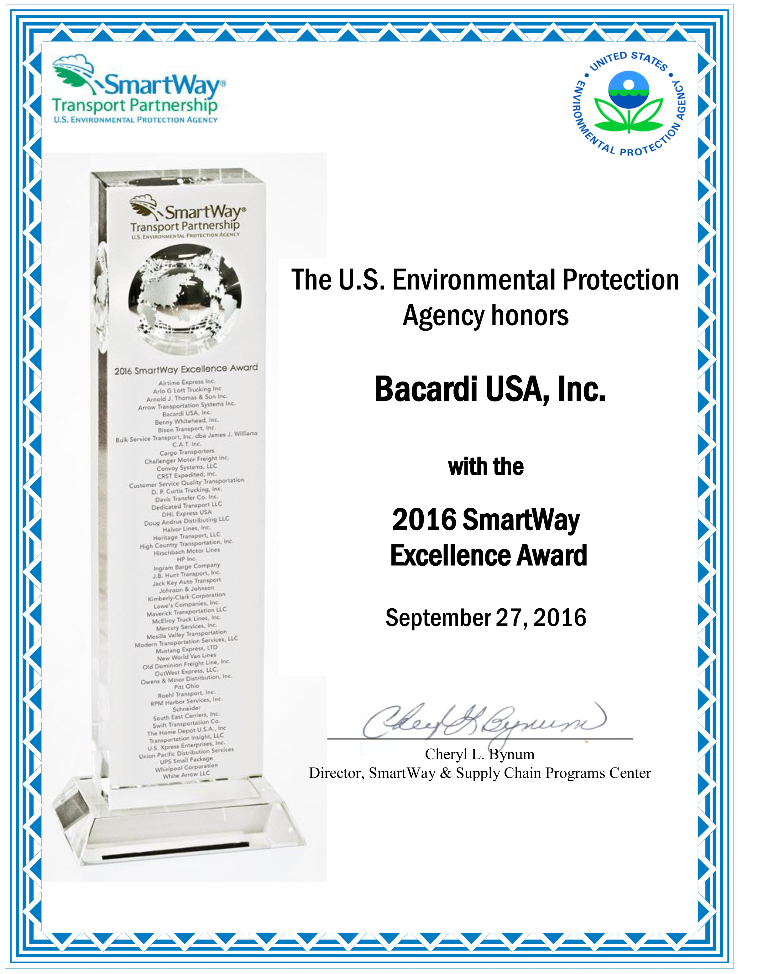 Coral Gables, Fla., September 27, 2016 ̶̶̶̶ For the second year in a row, the U.S. Environmental Protection Agency (EPA) honors Bacardi USA with a SmartWay® Excellence Award as an industry leader in freight supply chain environmental performance and energy efficiency in transportation logistics. The SmartWay Excellence Award, reserved for the top performing SmartWay Partners, is EPA’s highest recognition for demonstrated leadership.